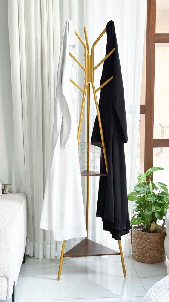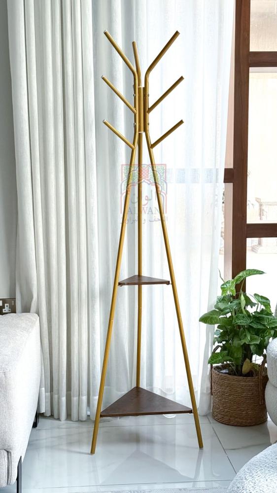 علاقة ملابس أرضية بارتفاع 180 سم - لون ذهبي و خشبي - 2أرفف تخزين
